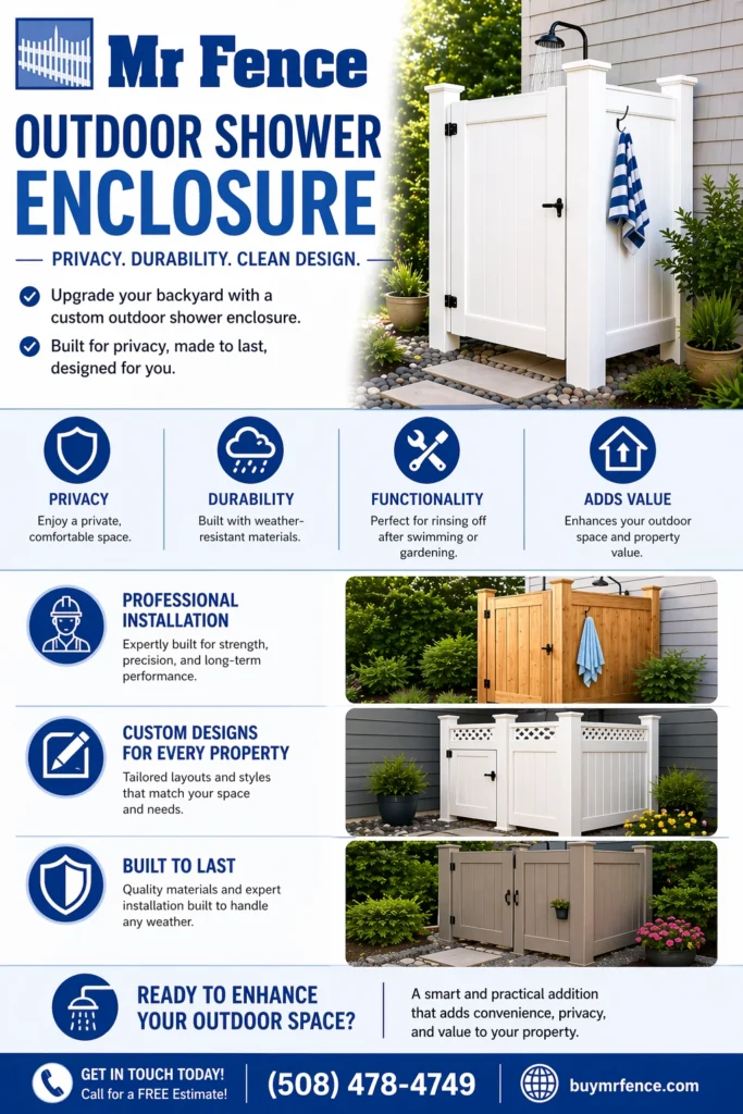 If you’re ready to enhance your outdoor space, an Outdoor Shower Enclosure is a smart and practical addition. With the right design and installation, it adds both convenience and value to your property. Visit our contact page to request a free estimate and see how Mr. Fence can bring your project to life.